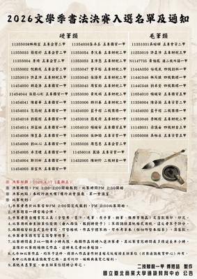 2026文學季書法決賽入選名單及通知(含毛筆類組及硬筆類組)