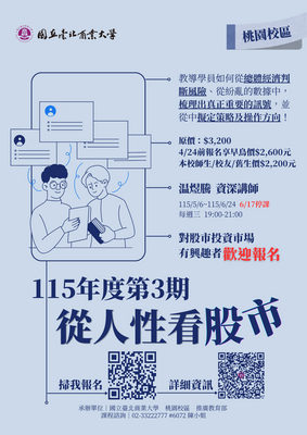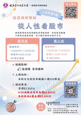 【桃園校區】115年度第3期《投資理財班|從人性看股市》115.5.6(三)開課!★熱烈招生中~歡迎報名!★