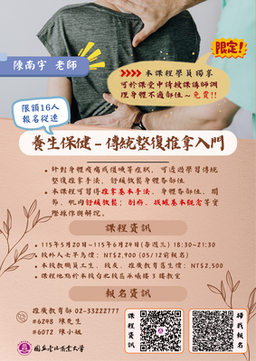 【台北校區】2026年「養生保健-傳統整復推拿入門」115.05.20(三)開班~熱烈招生中! 歡迎報名~