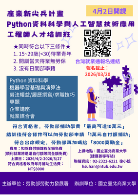 【產業新尖兵】Python資料科學與AI人工智慧技術應用工程師培訓班(第1梯次) 招生中