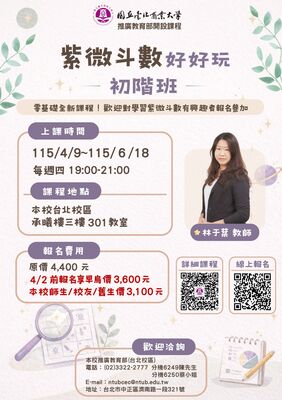 【台北校區】2026年度零基礎入門「紫微斗數好好玩-初階班(林于棻教師)」115.04.09(週四)開班~熱烈招生中~歡迎報名!