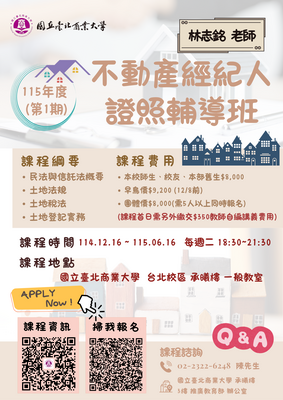 【台北校區】115年度 (第1期)「不動產經紀人證照輔導班」114.12.16(二)開課~熱烈招生中! 歡迎報名!